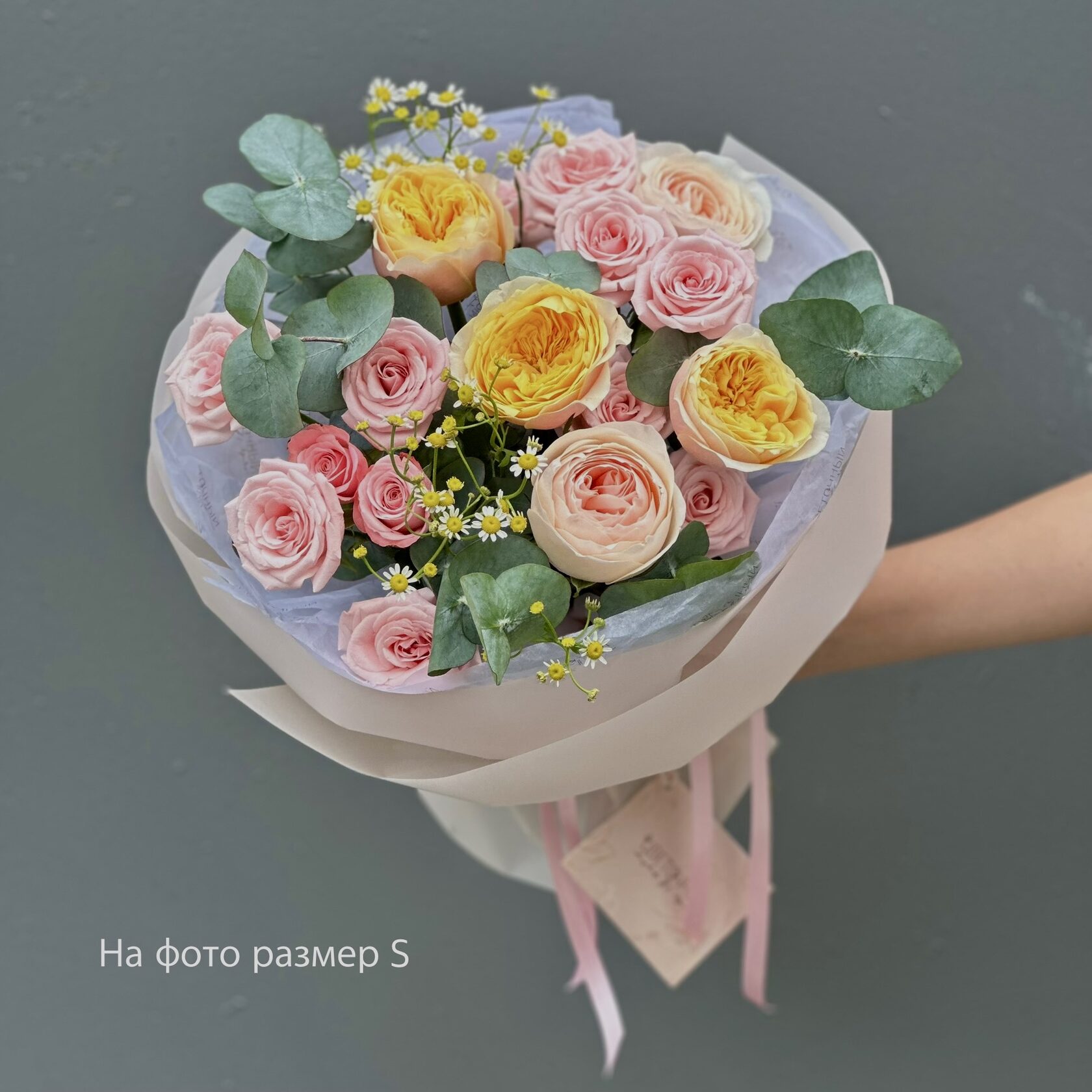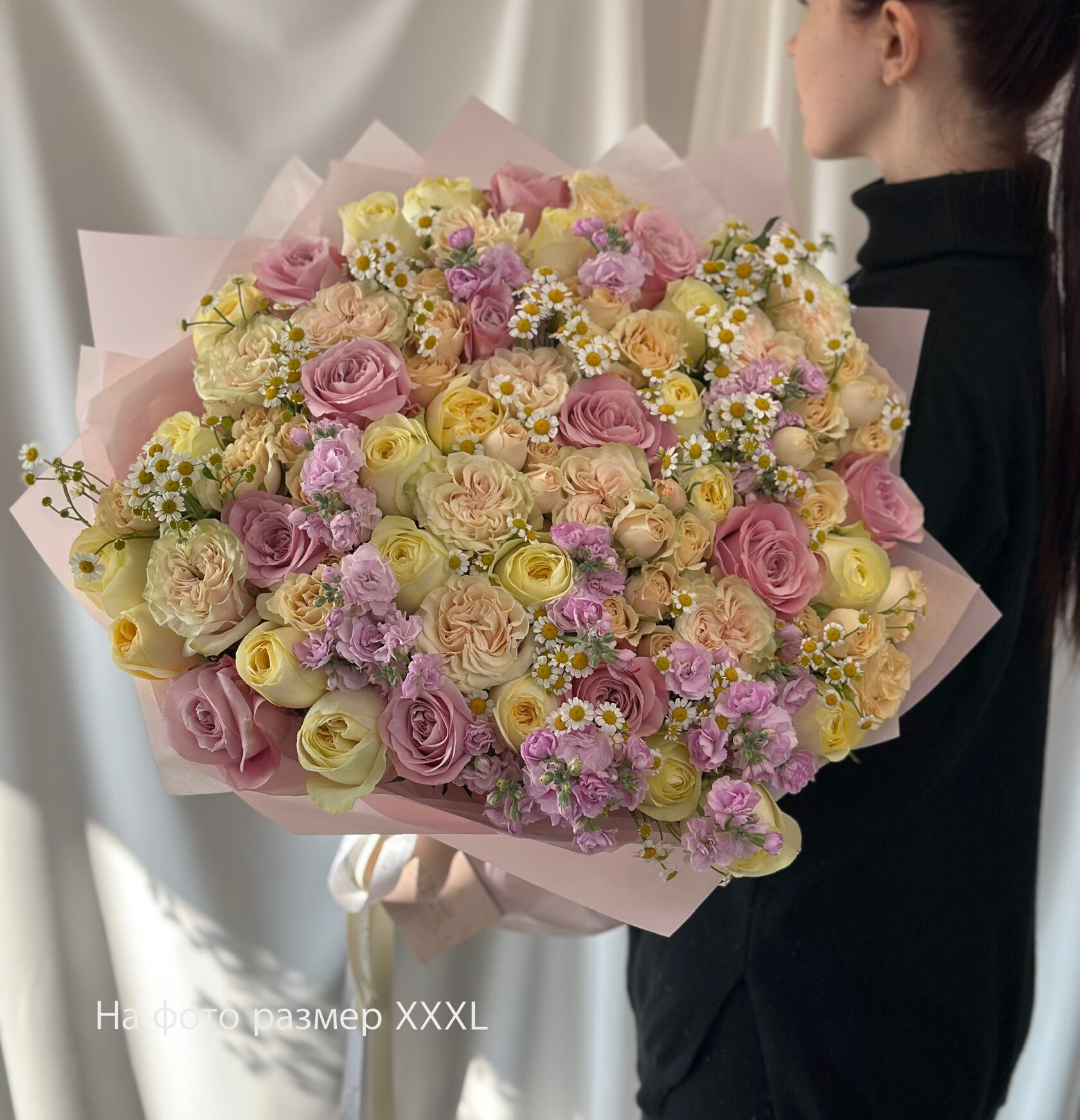 Состав: Пионовидные розы одноголовые и кустовые, эустома, хризантема, статица.