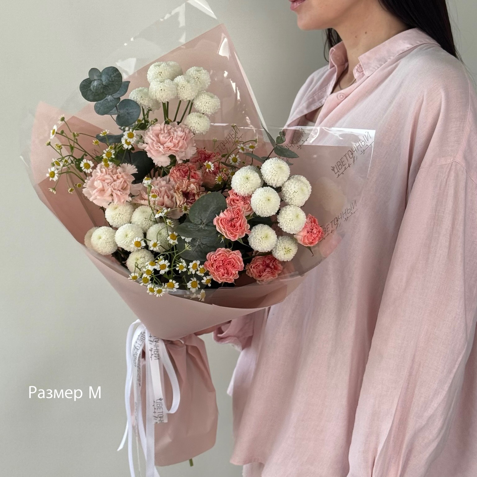 Состав: кустовые розы, хризантема кустовая, диантусы и матрикария.