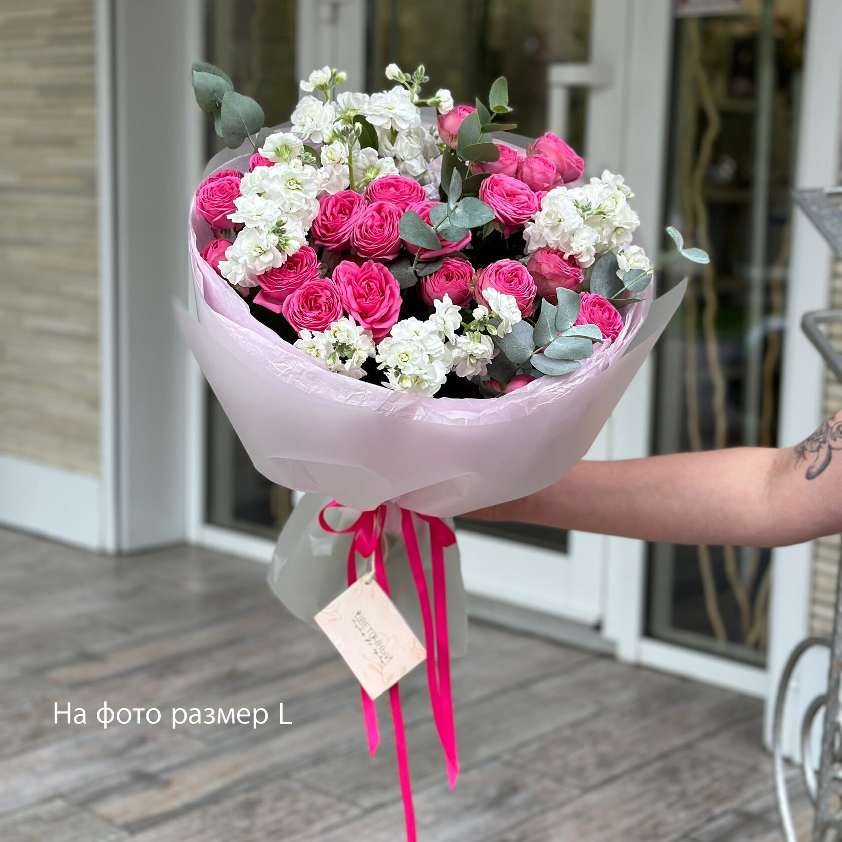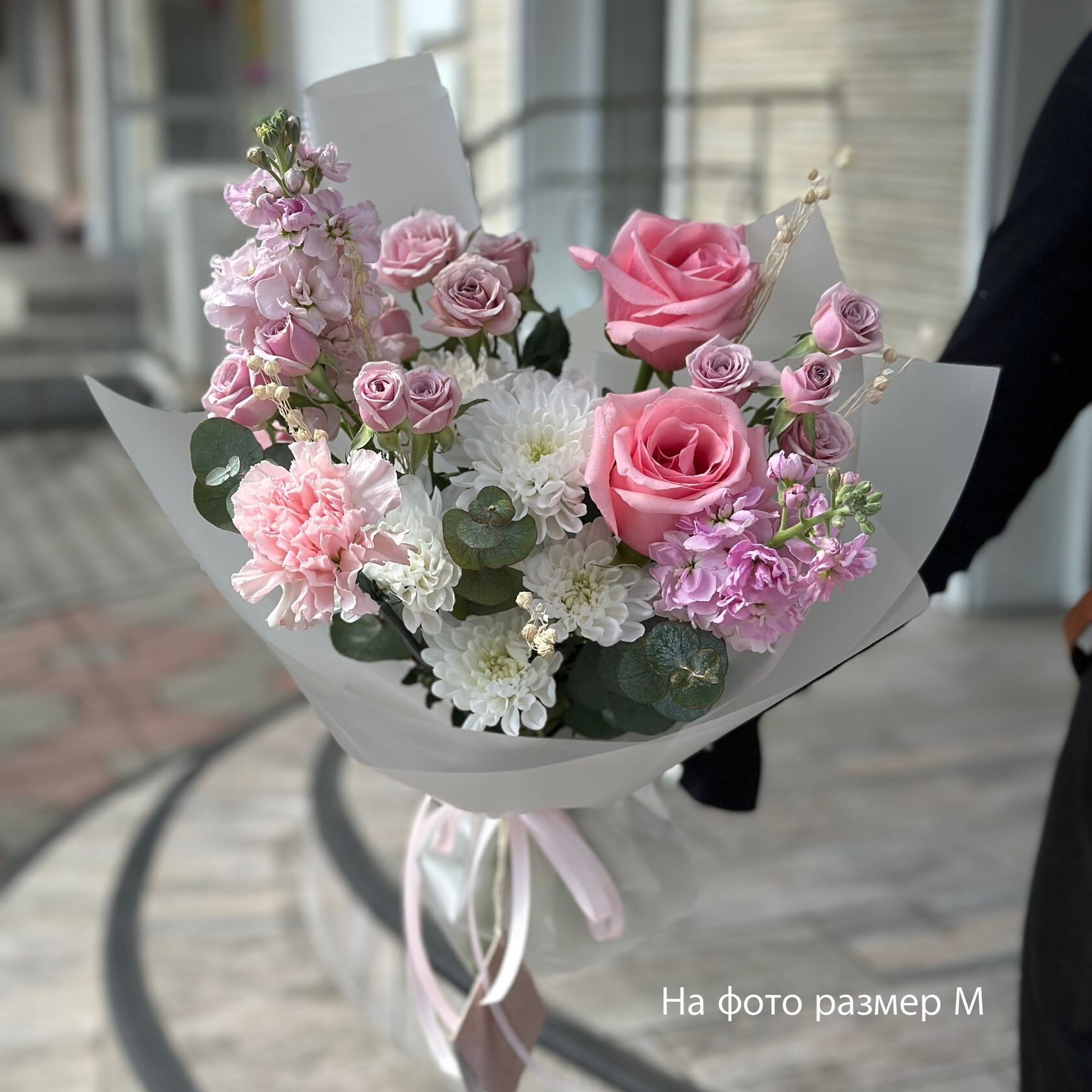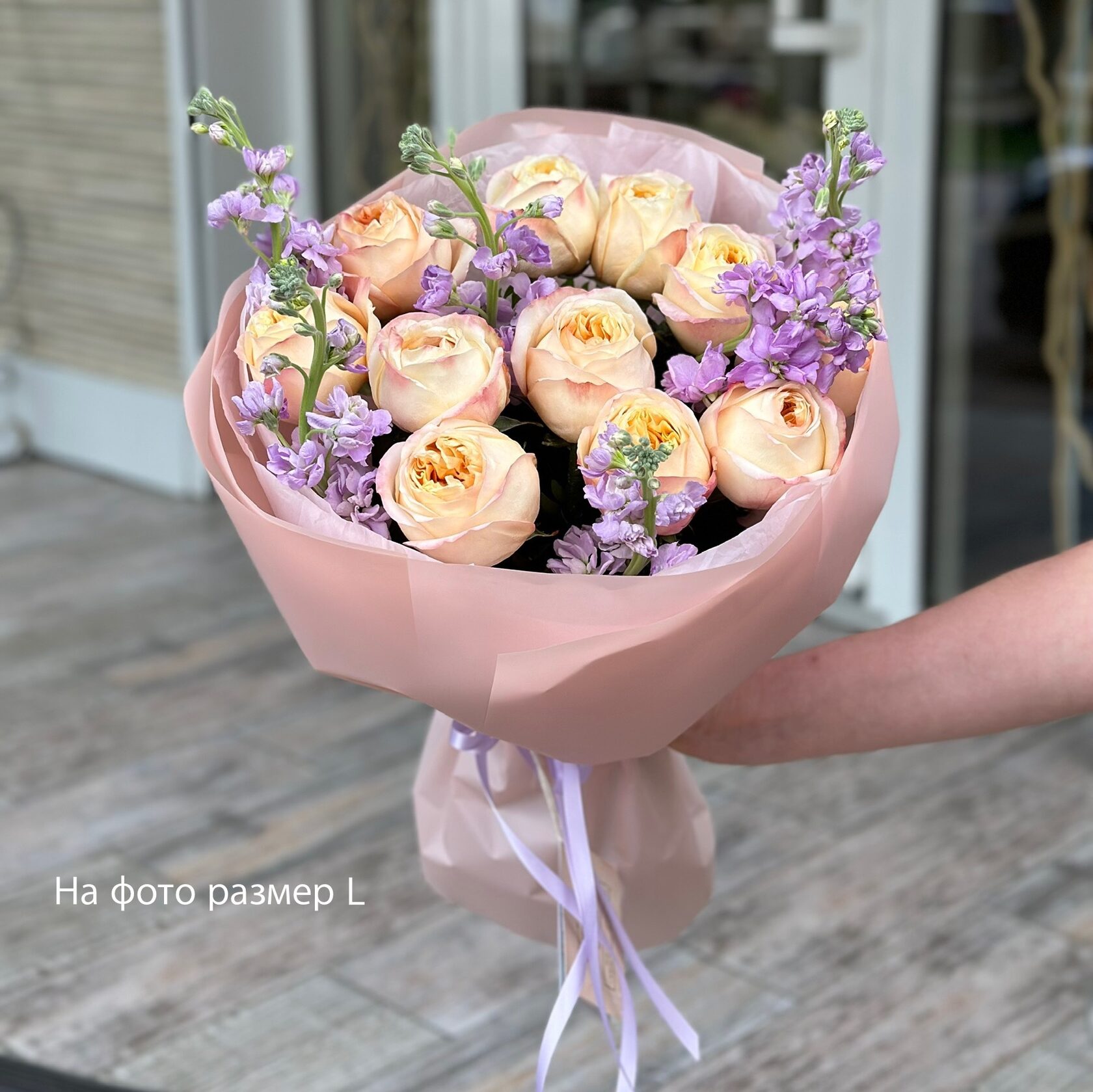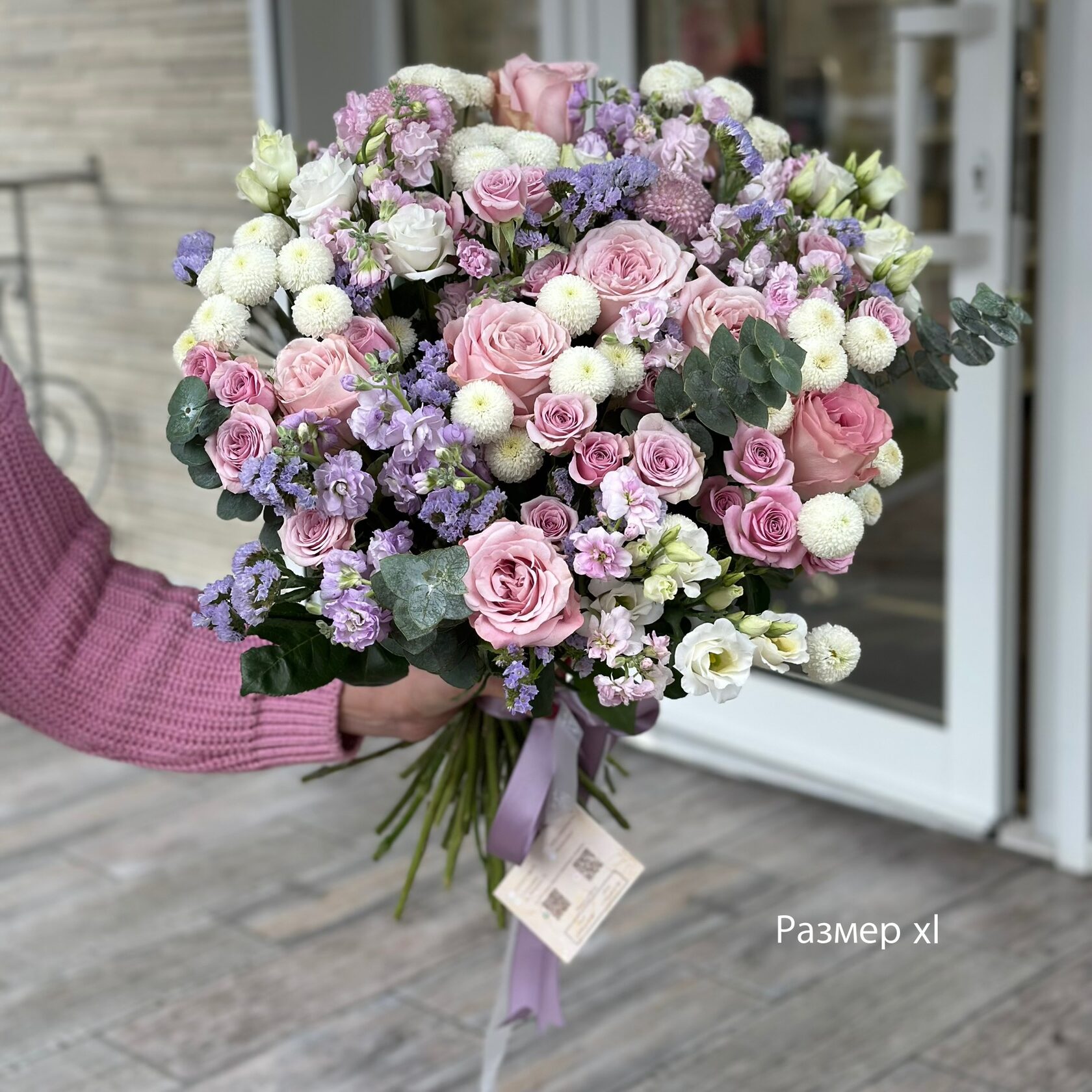 Состав: Одноголовые и кустовые розы, эустома, ароматная маттиола, кустовая хризантема, статица и эвкалипт.