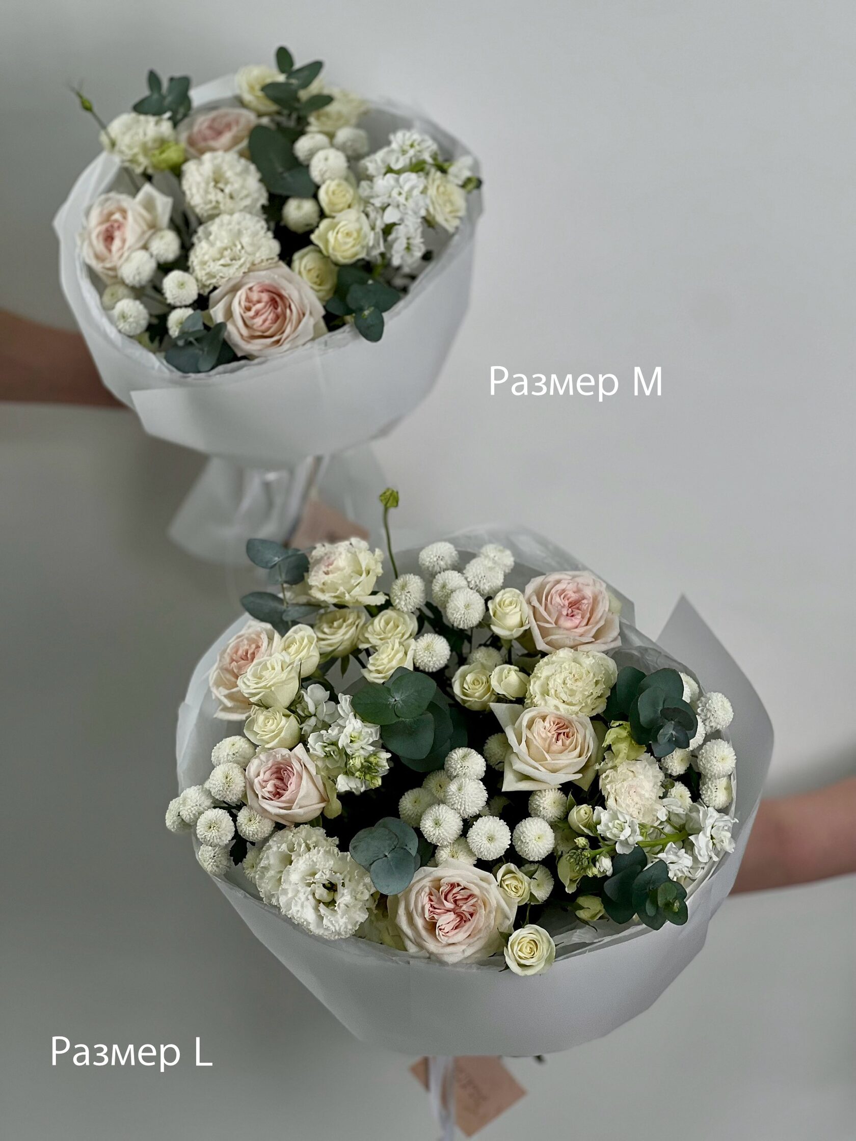 Соответствие образцу: на фото представлен пример букета. А каждый букет индивидуален и повторить его в точности практически невозможно. Так как цветы-это живой материал, они могут приходить к нам в разной степени раскрытия и пышности, формы и даже оттенка. Просим отнестись к этому с пониманием. Также мы оставляем за собой право на замены аналогичными сортами при отсутствии необходимого цветка в хорошем качестве. При этом мы всегда сохраняем цветовую гамму, форму и настроение букета.