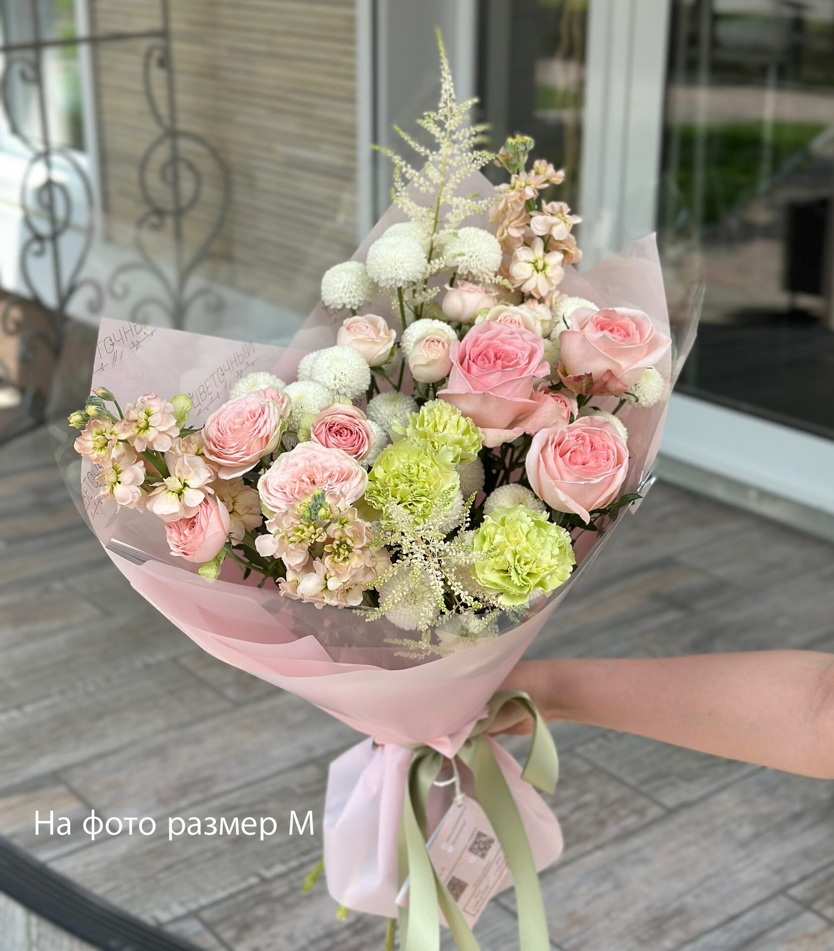 Состав: Пионовидная кустовая и одноголовая роза, маттиола, хризантема кустовая, матрикария, веточки астильбы и малины.